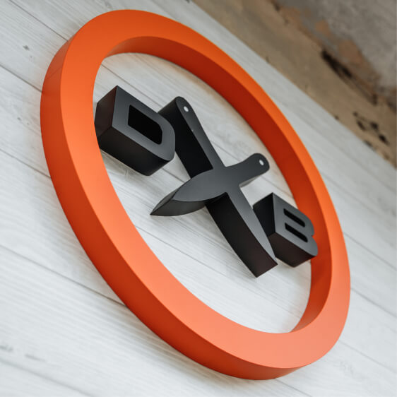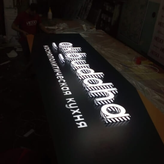 Объемные буквы с задником, рассеивающим свечение по поверхности (подложке или стене). Монтаж объемных букв с контражурным свечением производится на некотором расстоянии от фона, чтобы придать эффект контурной подсветки.