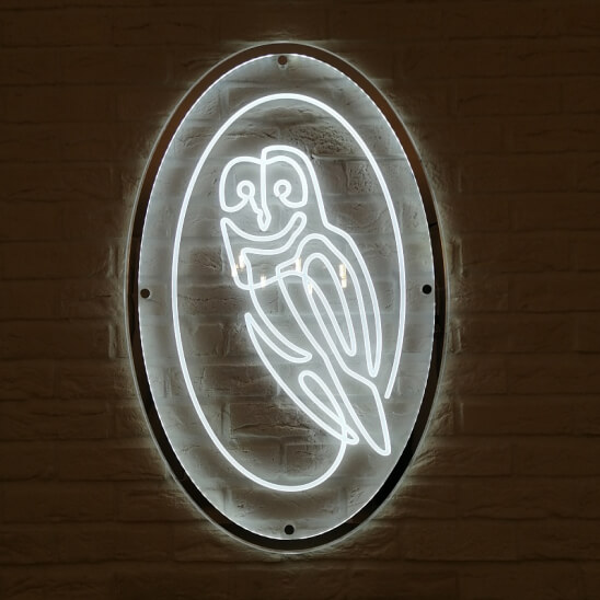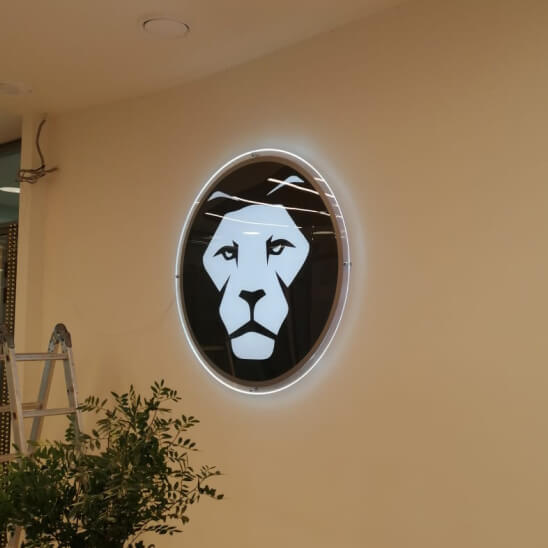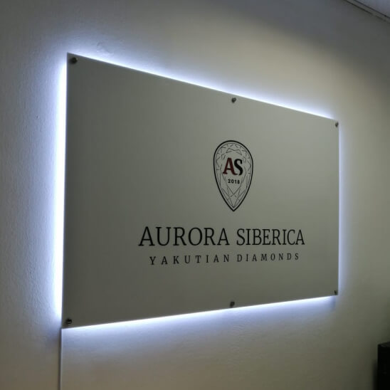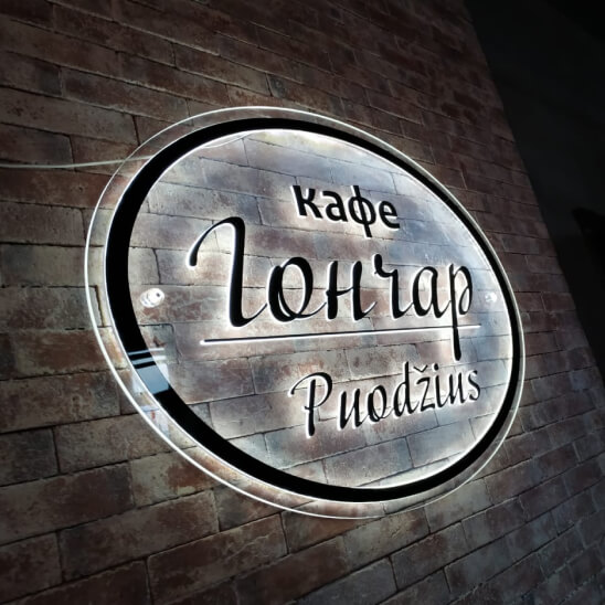 Световая панель из акрилового оргстекла с выгравированным рисунком (логотип или текс). Контуры рисунка наносятся на акрилайты с помощью гравировки, в качестве цветового наполнителя используется немецкая пленка oracal. Подсветка с торцевой стороны, именно поэтому возникает эффект свечения выгравированного контура.